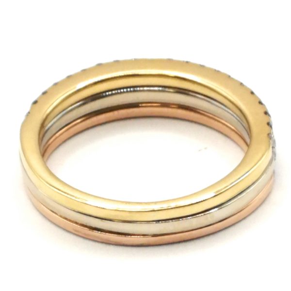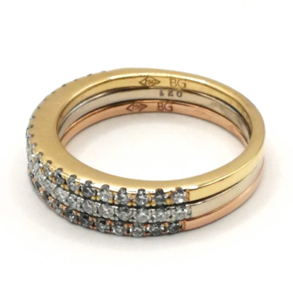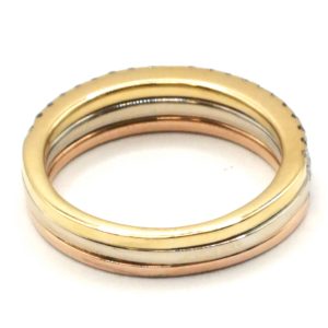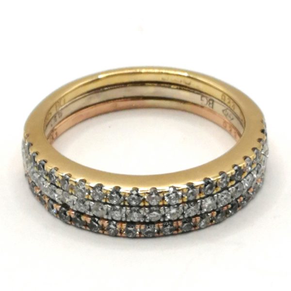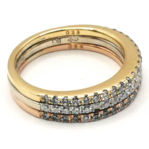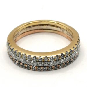 Make a statement with this stunning 18ct gold triple row ring, beautifully crafted in three shades of gold and set with sparkling diamonds. The elegant design combines sophistication with everyday wearability, making it a luxurious addition to any jewellery collection.