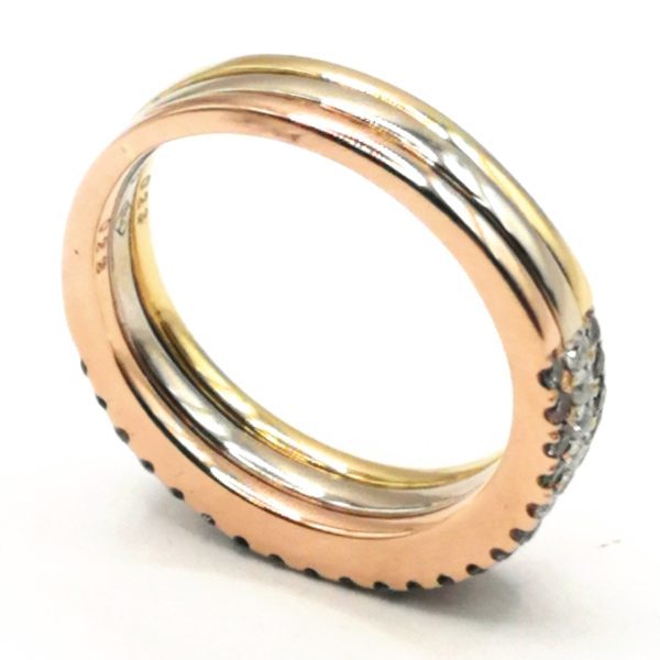 The grain-set diamonds are arranged in three dazzling rows, catching the light from every angle and enhancing the ring’s intricate tricolour design. Professionally hallmarked in Birmingham, this piece reflects quality, craftsmanship and timeless style.