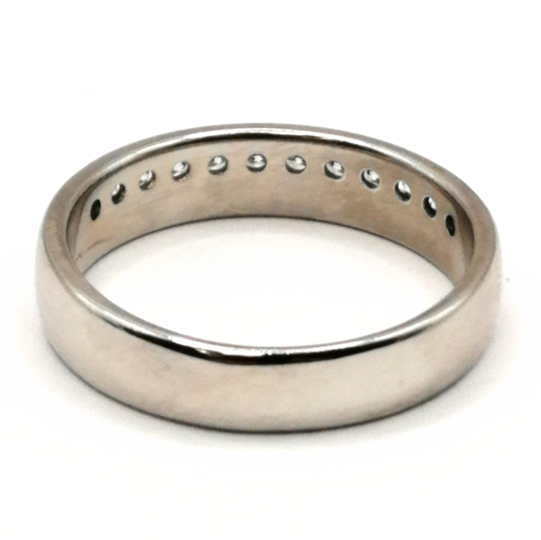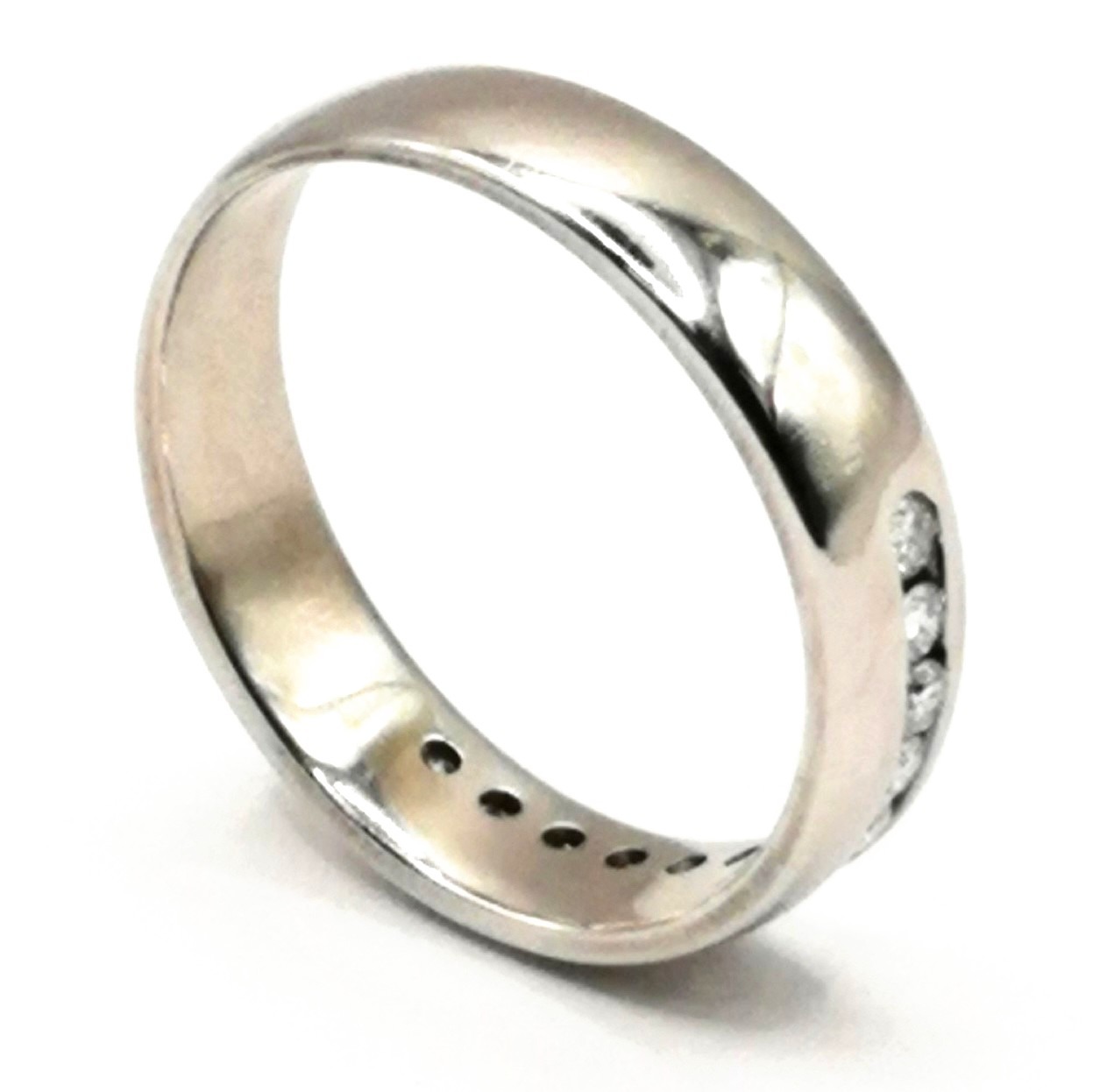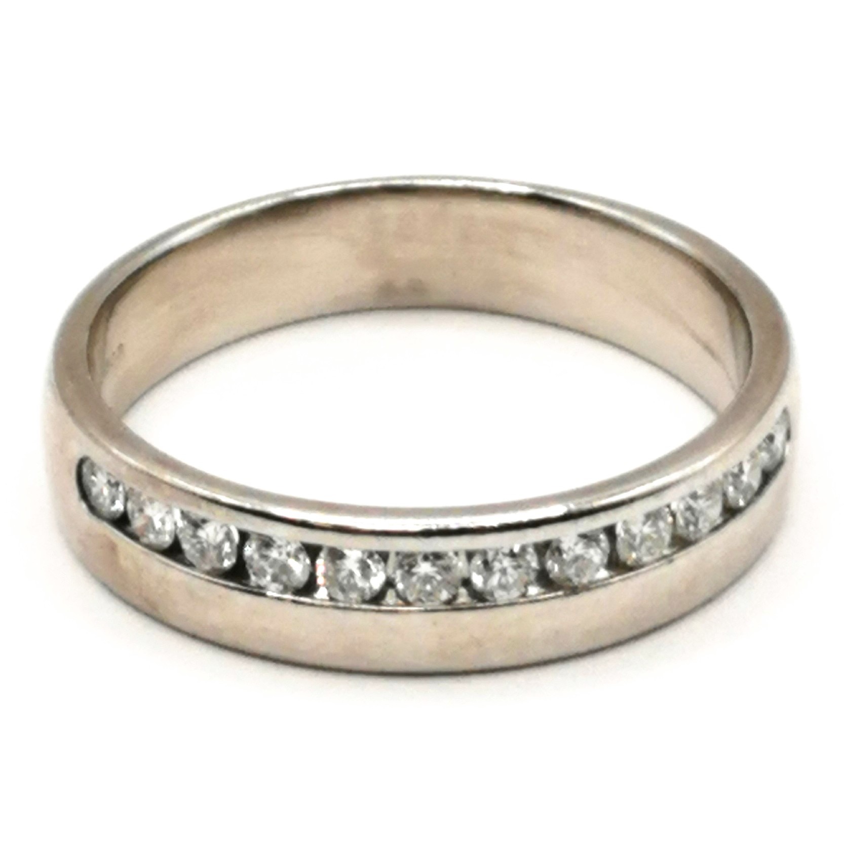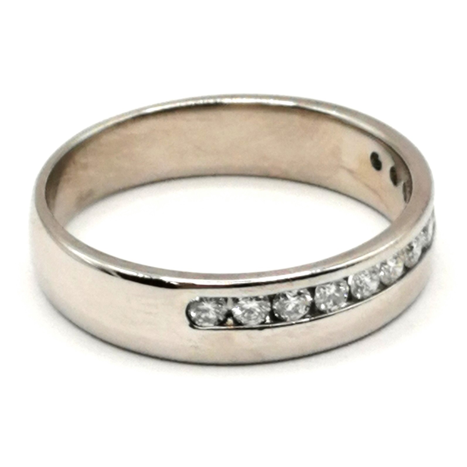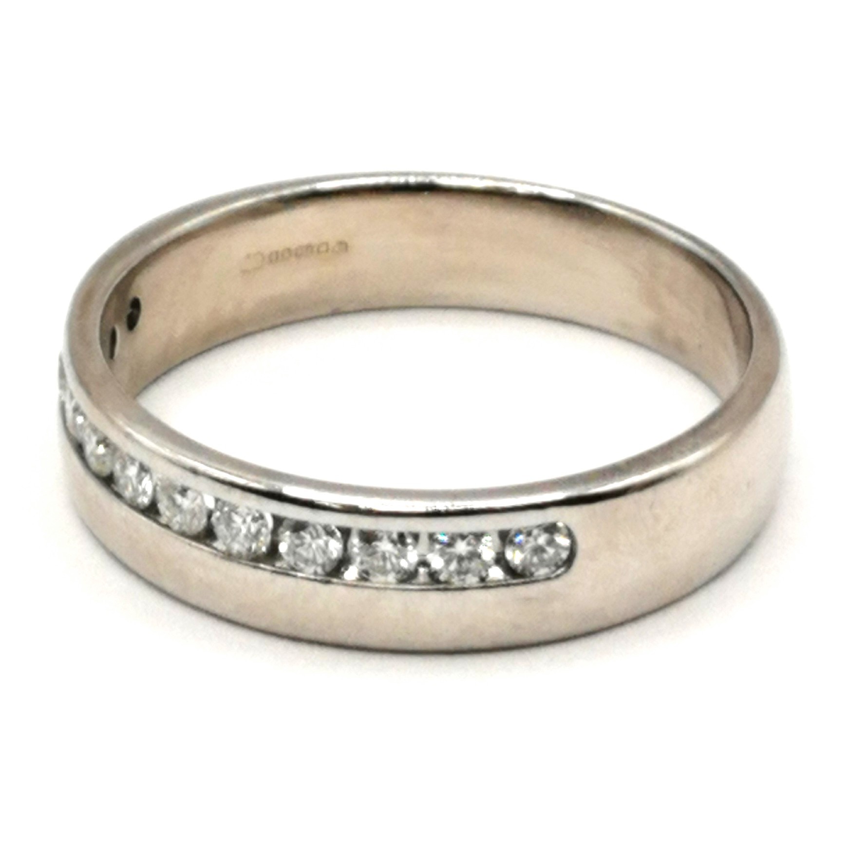 This elegant 18ct white gold band ring features a row of sparkling diamonds, securely channel set for a clean, contemporary finish. With a total diamond weight of approximately 0.30ct, the stones sit flush within the band, offering both brilliance and everyday wearability. Hallmarked in London in 2006, this piece combines timeless design with classic British craftsmanship — perfect as a wedding band, eternity ring, or refined stacking piece.