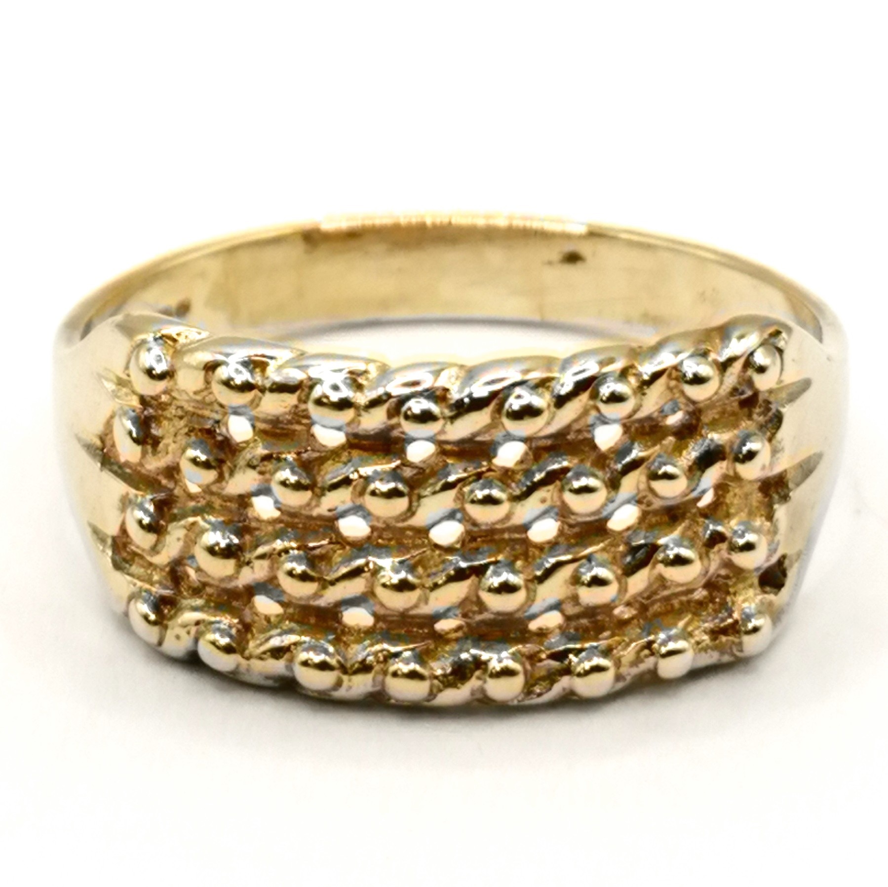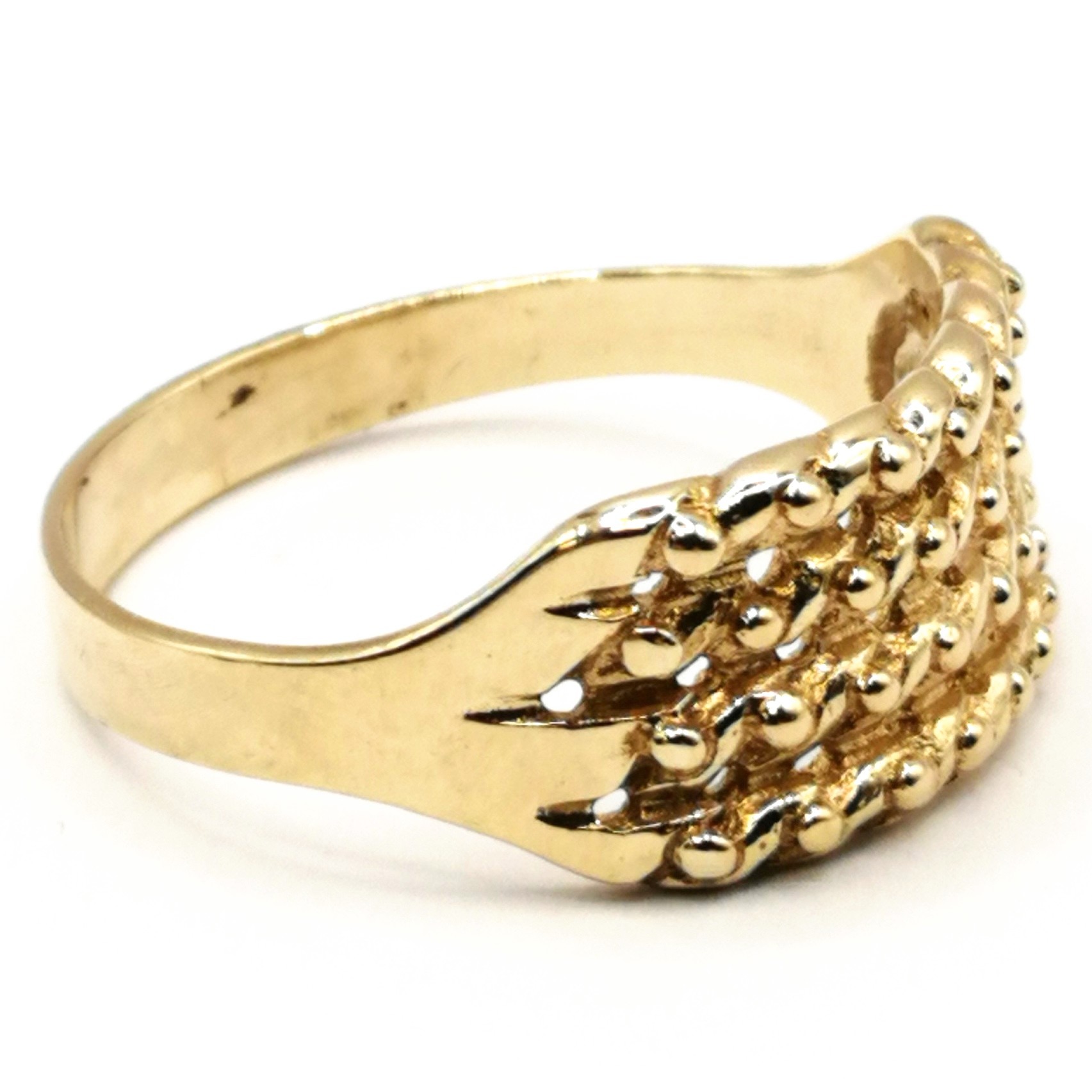 A timeless and elegant 9ct gold keeper ring, featuring a classic four-row design that offers both presence and sophistication. Crafted in solid gold, this traditional style is known for its enduring appeal and comfortable wear.