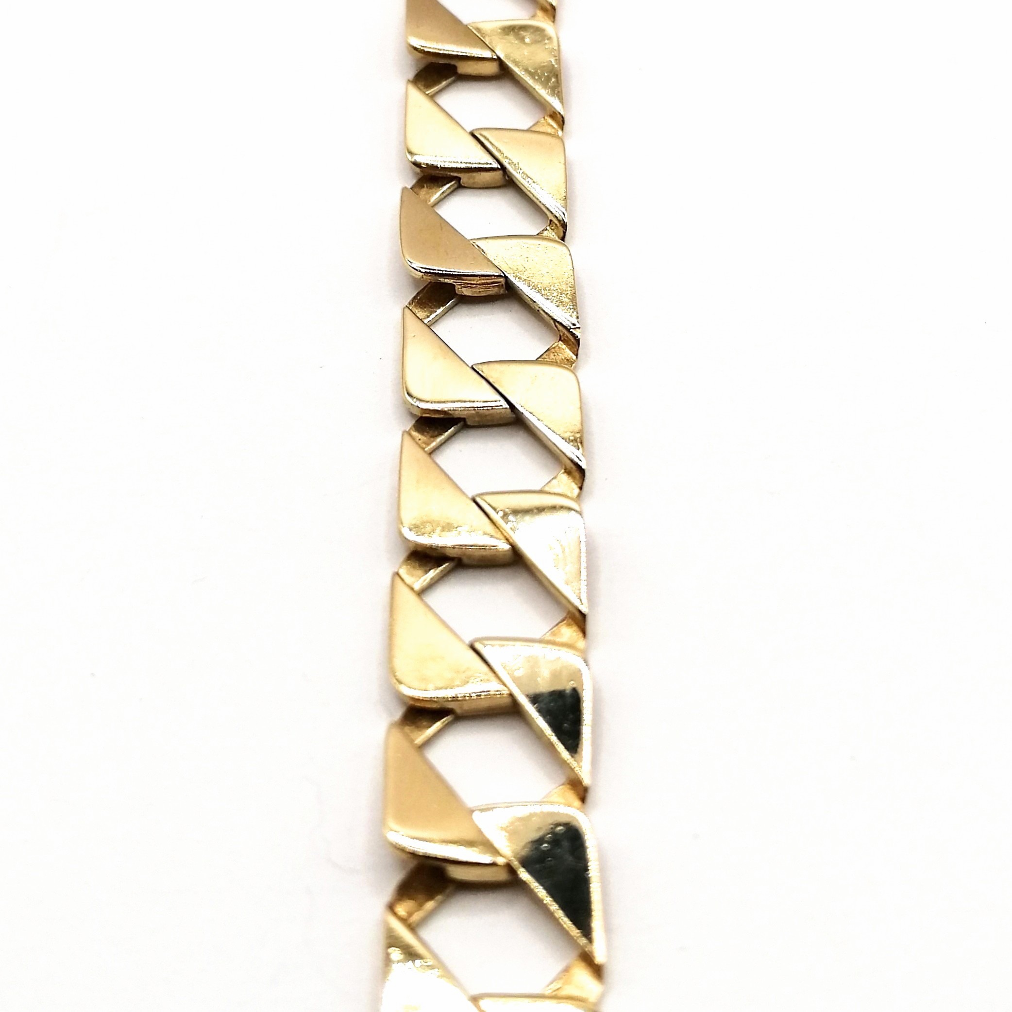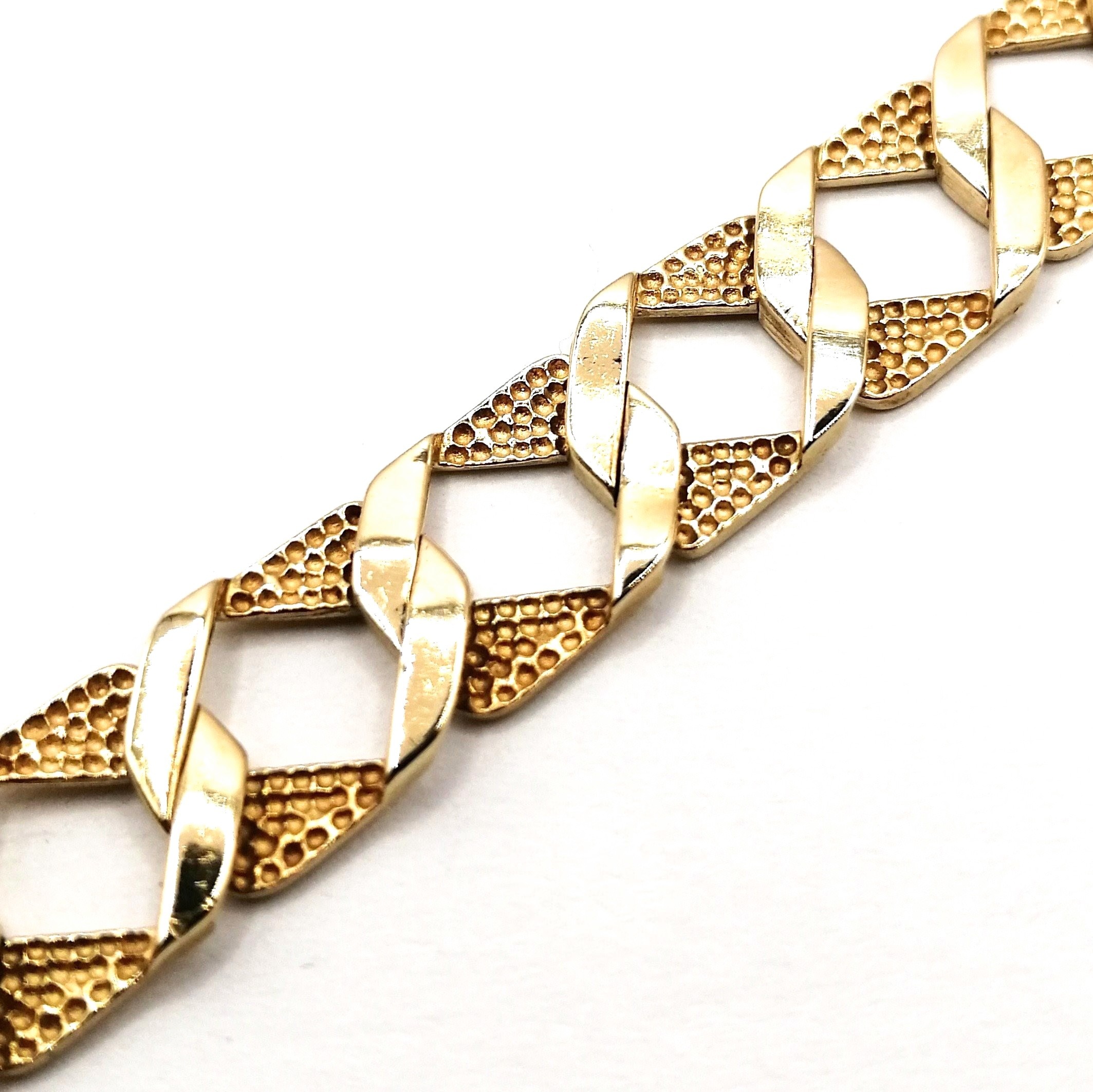A distinctive vintage 9ct gold square link curb bracelet, combining classic curb styling with an eye-catching square link design. The bracelet features a beautifully polished finish to the front, giving it a bright, refined look, while the reverse side showcases a contrasting plain and barked finish, adding texture and character.